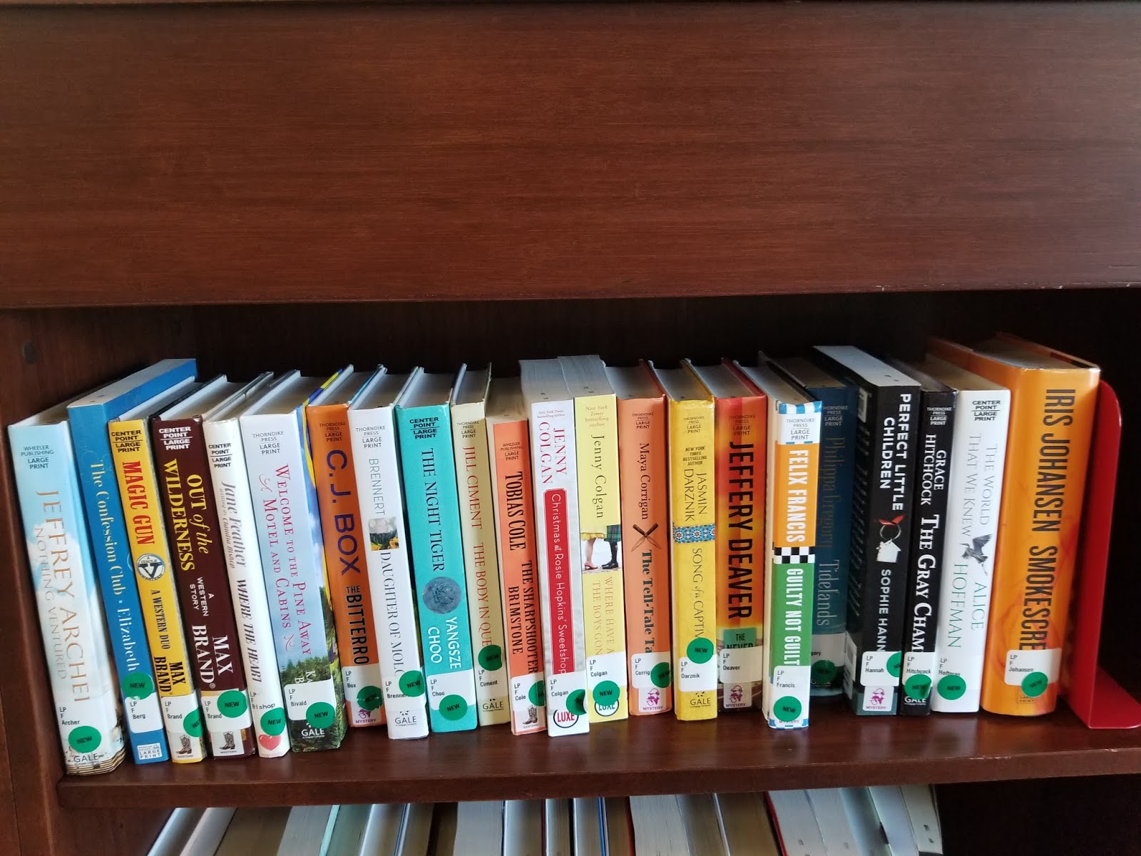 Large Print makes popular books more accessible for the visually impaired. I'm to the age where I need reading glasses so I can understand a little the allure of large print books. Here's the current selection of new titles at my branch: